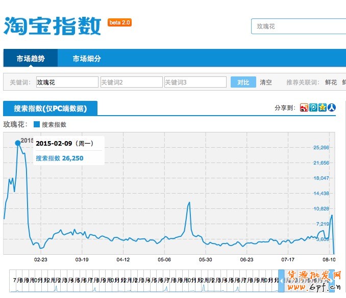 從淘寶指數(shù)可以看出,2015年情人節(jié)前兩周,淘寶搜索“玫瑰花”的人數(shù)急劇上漲。因此可以推斷出玫瑰花的成交高峰期就在節(jié)日前兩周左右。