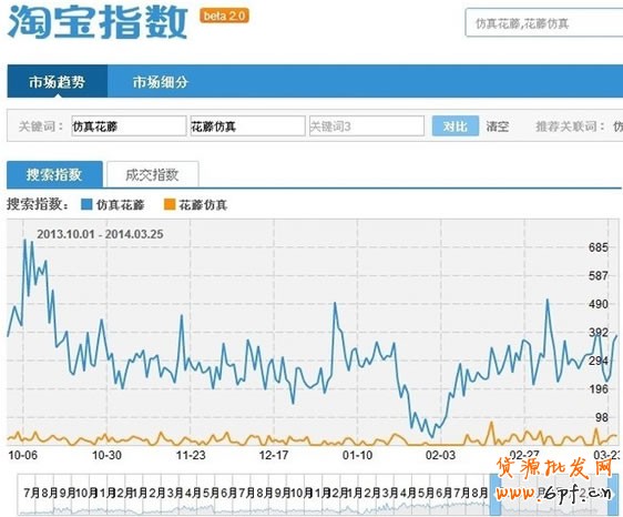 下面這第二張圖是搜索“仿真 花藤”和“花藤 仿真”的搜索指數(shù)圖: