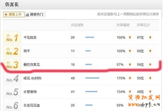 從上面兩張圖中,可以找到淘寶全網(wǎng)當(dāng)前最熱搜的詞,以及看出現(xiàn)在熱賣的寶貝品種是仿真落地花和仿真玫瑰花等。