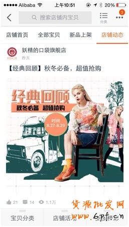 一起看看前臺的展現效果, 800*800的大圖展現,給商家以最大的展示空間,同樣也是對設計能力、微淘運營能力的最大考驗。大圖模式剛剛發布,就有不少賣家反饋,大圖不僅跟其他動態區分開了,而且單條動態的流量確實有明顯的提升。