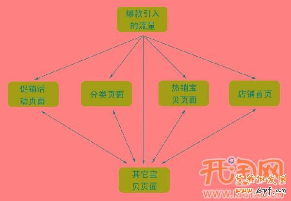 對于爆款帶來的流量,一定要好好把握住,關聯你的店鋪中的其它寶貝,盡可能讓客戶看到你店鋪中的其它頁面,比如:促銷頁面、分類頁面、首頁等,讓客戶在你店鋪中的訪問路徑形成一個閉合回路,看下面的圖:
