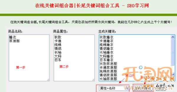 進入在線關鍵詞組合器(請自行搜索),輸入相應的商品名稱和商品屬性,選擇一種組合方式,例如屬性+名稱,最后點擊生成關鍵詞就可以,如下圖所示。