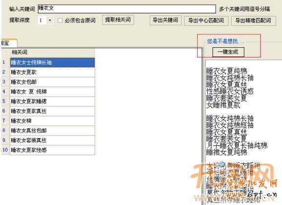 打開該工具,輸入一個中心詞,比如“睡衣”“睡衣女”,點擊提取相關詞,等下面關鍵詞出現完畢后,點擊導出關鍵詞,就可以保存搜到的詞,這部分就是淘寶首頁搜索框下的熱門詞,我們可以在里面挑選適合推廣寶貝的關鍵詞去添加。
