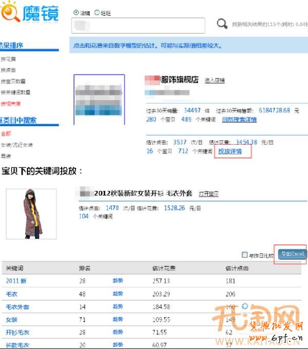 登陸直通車魔鏡,查看一些大的店家,直通車的投放情況,查看不同寶貝下的關鍵詞投放,可以導出使用。