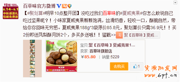 從新浪與阿里自共同發(fā)布“微博淘寶版”內(nèi)測消息以來,雙方共同邀約了百余家淘寶店鋪,對微博淘寶版進行測試和體驗。今天從中挑選出一家具有代表性的店鋪官方微博——@百草味官方微博進行分析,以其在測試期的微博推廣和數(shù)據(jù)表現(xiàn),來介紹一下微博淘寶版。