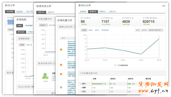 后臺除了擁有大家熟知的微博功能外,可以看到還專門增加了一個數(shù)據(jù)中心,包含了粉絲分析、商情監(jiān)控、微博頁面分析、店鋪流量分析和影響力分析。這些數(shù)據(jù)工具不僅能夠全面展現(xiàn)微博運營的狀況,更可以展示導流數(shù)據(jù)。