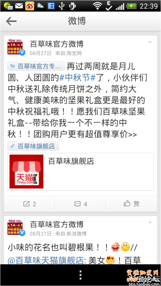 百草味在淘寶網(wǎng)開的集市專營店在旺鋪后臺開通微博淘寶版后,帶來了幾項明顯的變化。