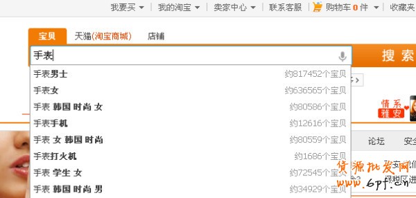 這個沒辦法一次就學會的,這個倒是要慢慢累積經驗跟方法的。我的方法就是:首先我們看到一個寶貝,就要想到怎么優(yōu)化它,該從哪里著手。這時候我就會選擇去淘寶搜索那里看看,輸入一個大詞,也就是我們的類目關鍵詞。在這里我就以手表為例子,大家請看。