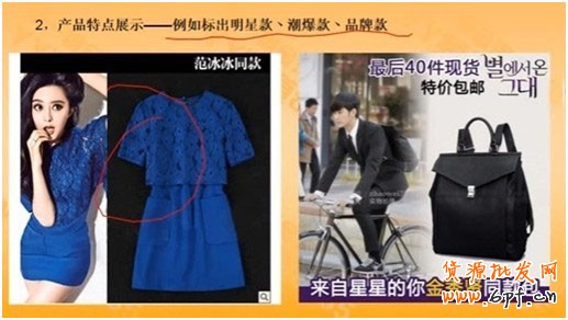 1、商品的品展示類(lèi),包括色彩、細(xì)節(jié)、優(yōu)點(diǎn)、賣(mài)點(diǎn)、包裝、搭配、效果。