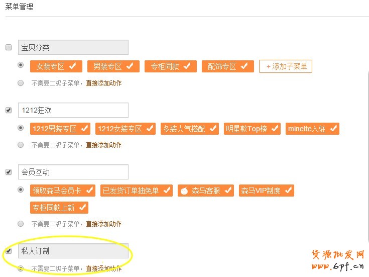 2、:只要在無線運營中心(http://wuxian.taobao.com/)-自定義菜單-勾選私人訂制就可以在無線店鋪首頁透出啦!(注意,自定義菜單最多只能選擇3個)