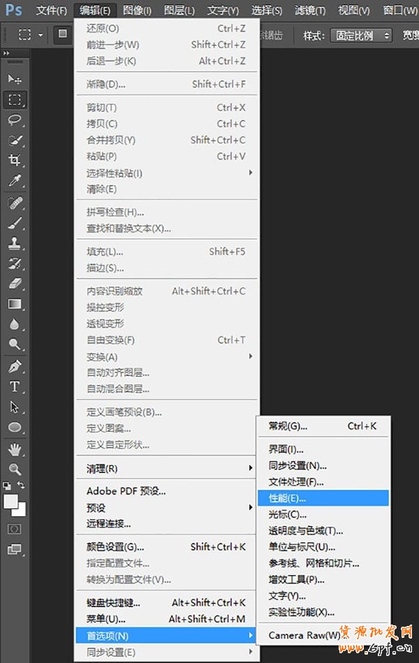 photoshop不再卡頓,這里只需做出一些設置。在菜單欄找到“編輯”--“首選項”--“性能”,如下圖所示;