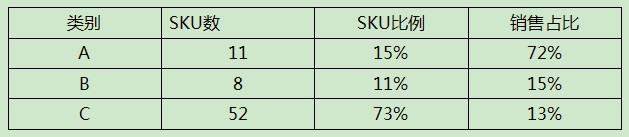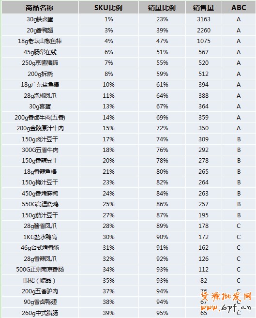 將累計配貨次數(shù)為50%的前若干品種定為A類;將配貨次數(shù)為20%左右的若干品種定為B類;將其余的品種定為C類。如: