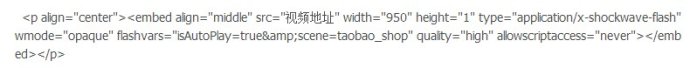 視頻地址可以自己更換,推薦使用youku的,高度為一個像素,確保其可以隱形。自動播放無廣告,親測隱形加載幾乎不占用頁面加載速度,你可以找心儀歌曲的mv,有能力的用軟件處理幾個視頻,把歌曲銜接起來在上傳獲得鏈接,就可以實現(xiàn)不同歌曲輪流播放的效果啦~或者您可以自己錄一段視頻,把自己想說的話,店鋪的活動及特色等加進去做成類似掌柜說,空間喊麥的效果。以上代碼無循環(huán)播放功能,需要的親可自行添加。