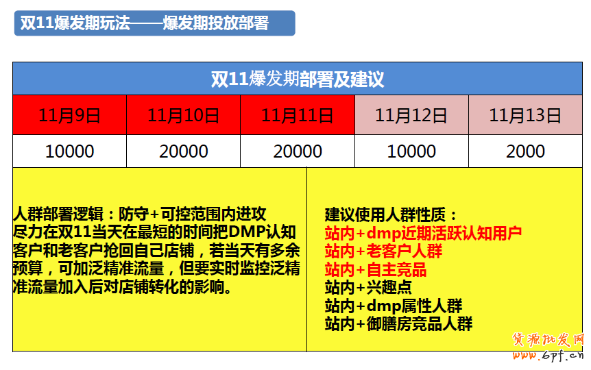 爆發期:最后就是在爆發期的部署,可以重點把預算用在11月10號和雙11當天,這時候只要把對店鋪有過認知的客戶和老客戶守住就可以了,因為拉新成本非常高。