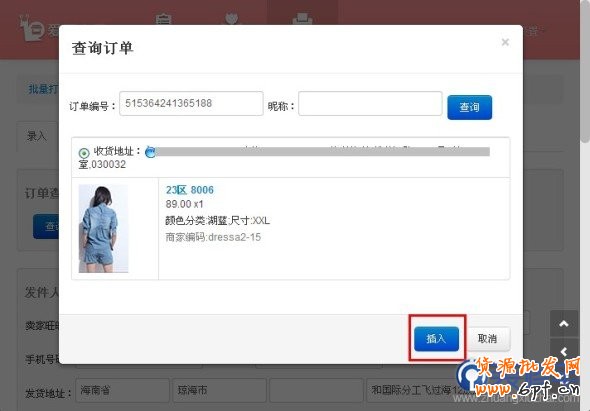 你可以選擇你的任何狀態(tài)的淘寶訂單 進行打印,點擊“查詢淘寶訂單”可以通過訂單編號或者買家昵稱進行查詢,選擇你想要打印的訂單,點擊“插入”: