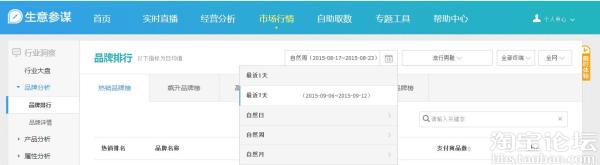 首先,市場行情大部分地方的數據在時間段選擇上提供:1天 7天 自然日 自然周 自然月 自定義時間;在平臺上分為淘寶、天貓和全網;終端上分PC端、無線端和全部終端。也就是說,市場行情提供了目前為止最全面的無線行業數據。市場行情絕大部分地方提供三年的行業數據供分析參考