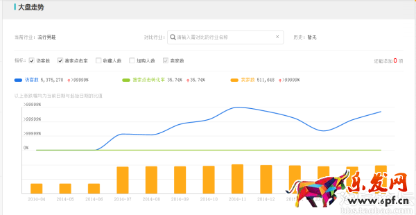 行業大盤提供了訂購類目整體走勢情況,提供當前類目的訪客數、賣家數、收藏加購數。同時提供了多個數據的趨勢變化圖,疊加對比圖。方便直觀。一眼了解行業核心數據變化趨勢。