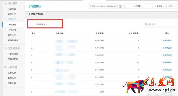 產品粒度就通過篩選品牌,產品來看到產品的熱銷商品榜和流量商品榜,選好之后會有數據展現。