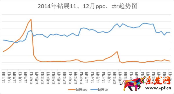圖一:2014你那直通車11月、12月PPC、ROI趨勢(shì)圖