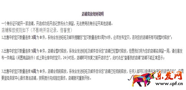 如果3周內店鋪沒有上架任何商品,淘寶會把店鋪定性為暫時釋放;如果5周內仍然沒有上架商品,店鋪進入暫時釋放期,店名將保留一周;6周后,店名將徹底釋放,任何人都能申請使用。