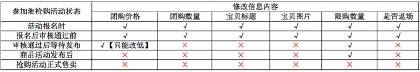 4、審核通過(guò)后不能修改寶貝原價(jià),各階段可修改信息見(jiàn)下表: