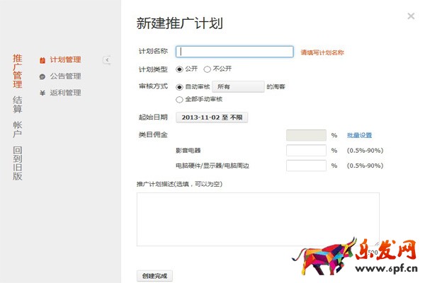 四、填寫新建推廣計劃的資料,如:名稱、類型、審核方式、起始日期、傭金、描述。