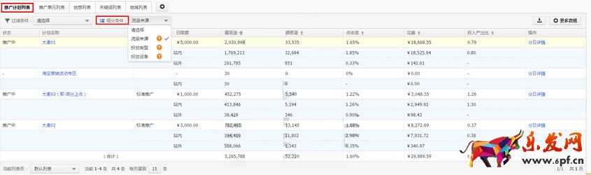在推廣計(jì)劃列表中,我們可以點(diǎn)擊細(xì)分條件(圖中紅框處),選擇流量來(lái)源,投放類(lèi)型,投放設(shè)備等3個(gè)不同選項(xiàng),流量來(lái)源分為站內(nèi)與站外,站內(nèi)站外流量對(duì)比,可以幫助您了解流量的來(lái)源與接下來(lái)的投放比例;投放類(lèi)型分為關(guān)鍵詞推廣和定向推廣,定向的作用是精準(zhǔn)人群,可根據(jù)需要與效果進(jìn)行投放;設(shè)備類(lèi)型分為計(jì)算機(jī)設(shè)備(PC端)和移動(dòng)設(shè)備(無(wú)線端),現(xiàn)在主要是以移動(dòng)設(shè)備為主。