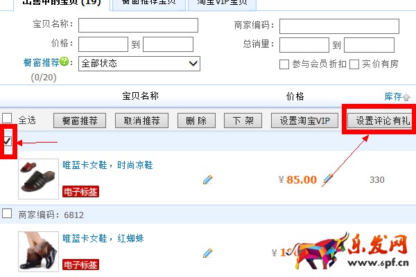 步驟一:打開賣家中心,找到寶貝管理 - 出售中的寶貝,在我們要設置評價有禮活動的寶貝前面的方框里打鉤,點擊設置評價有禮,第一次設置的新手賣家需要開通一下設置評價有禮,再回到出售中的寶貝重新選擇一次哦。