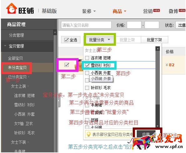 第二步:勾選需要分類的商品(商品性質(zhì)一樣的可以點(diǎn)擊“全選”例如全部都是連衣裙或者其他的同種類型,否則“在下面勾選需要分類的商品”,不要點(diǎn)擊“全選”)