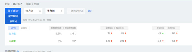 百度和淘寶雖然不是一家的但是百度搜索的數據是能從一方面去反映出消費者的需求的。那首先搜索“連衣裙”和”半身裙“兩個詞的對比。