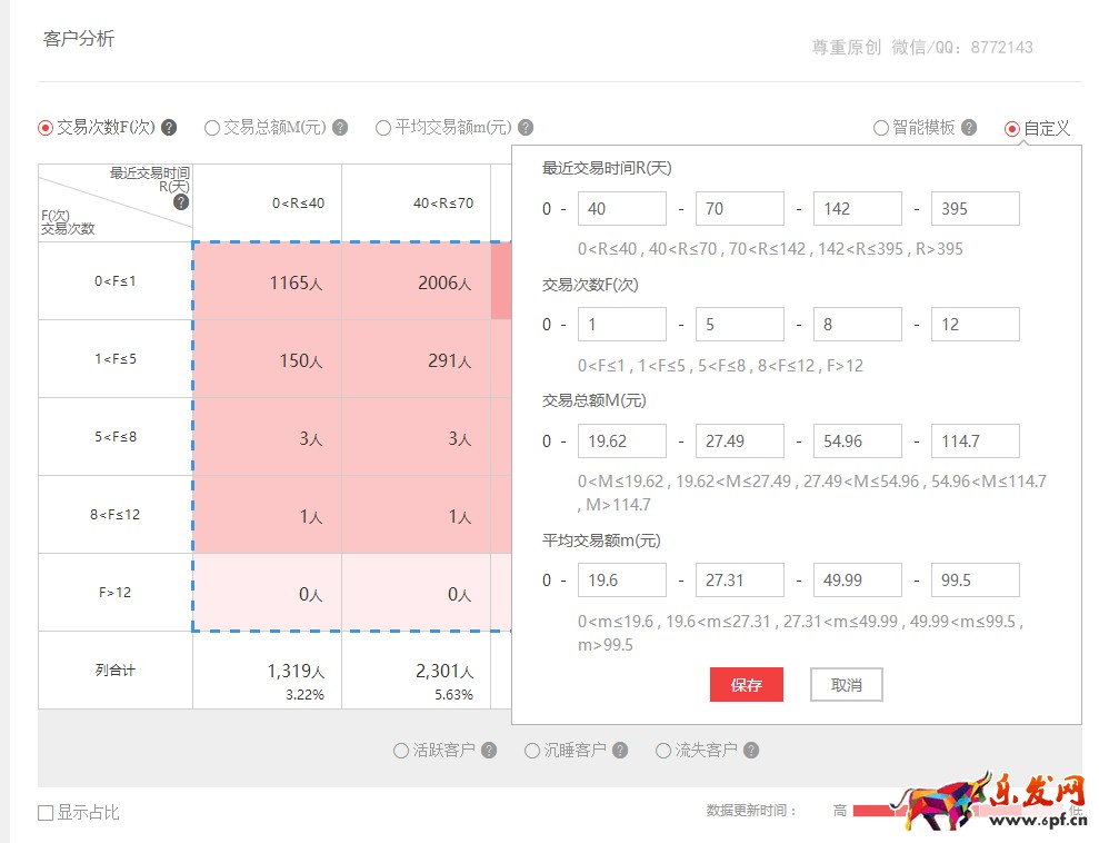 客戶數據這是每個應用系統所具有的通用模塊,對淘寶來說要想知道你鄰居的狗是否喜歡你鄰居女票裙子的顏色,不是難事。正因為如此強大,淘寶的用戶數據才顯得更清晰、可見。淘寶采用R(最近一次消費時間)F(一定時間內的累計購買次數,即購買頻次)M(一定時間內的購買金額)作為客戶的標簽屬性來劃分,當然你要是覺得默認的智能模板不適合你的類目及商品可以選擇自定義來重新定義RMF數值區域。