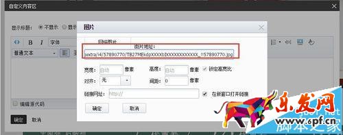 4、編輯自定義內容區,并插入圖片,將之前復制好的圖片代碼粘貼進圖片地址,點擊確定