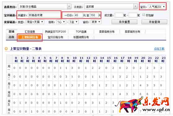 我擦,這玩意兒還要配合!當然需要,說過很多次,店鋪做的好不好,其實都是一個又一個的細節堆積到一起的,這一點我做到了,你沒有做,至少在這個得分上,我就取得了領先。。我們假設一下,你準備重點優化的關鍵詞,根據店鋪的實際情況,準備是:長袖連衣裙。路徑:生e經——行業分析——我的情報——情報助手——選擇好類目——寶貝按人氣前200排序——填好關鍵字——選擇好你準備競爭的價格區間——點擊上架時間分布,看下圖:哎呀,我去!這數據太牛逼了吧!是的,太牛逼了!(注:截圖都是截了一半兒,不完全,然后數據可以下載!)