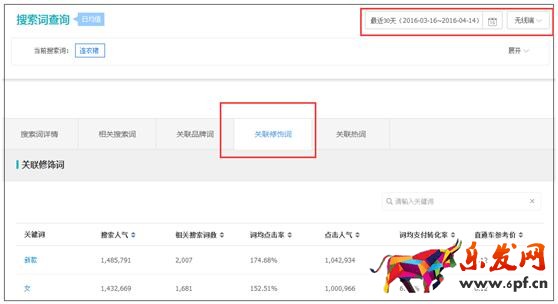 打開(kāi)生意參謀,看市場(chǎng)行情——搜索詞分析——搜索詞查詢,輸入產(chǎn)品詞,我們以“連衣裙”為例(連衣裙:你妹啊,有意思么,你能不能換一個(gè)!),選擇最近30天的數(shù)據(jù),選擇無(wú)線端(不要問(wèn)為什么,累),然后點(diǎn)擊關(guān)聯(lián)修飾詞: