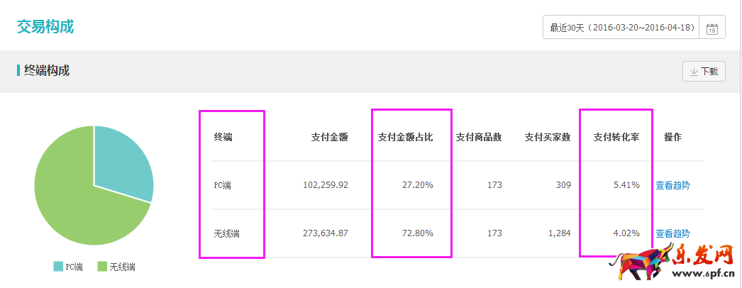 目前車上推廣四款寶貝,是店鋪銷量較好的四款寶貝,日花費限額在200左右,過去30天累計投產13。直通車上無線端流量占到大部分,而且無線端的點擊率明顯高于PC端,有利于提升無線端關鍵詞的質量得分,達到降低平均花費的目的,在消耗相同的情況下,能夠引進更多的流量。