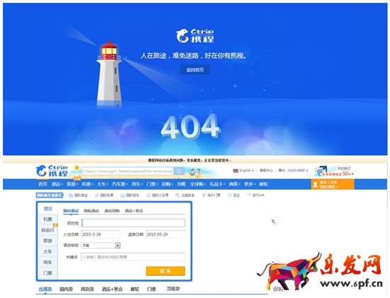 打開攜程官網,頁面顯示404出錯,返回首頁后只能進入其官網首頁,當中鏈接及多項功能均無法使用。