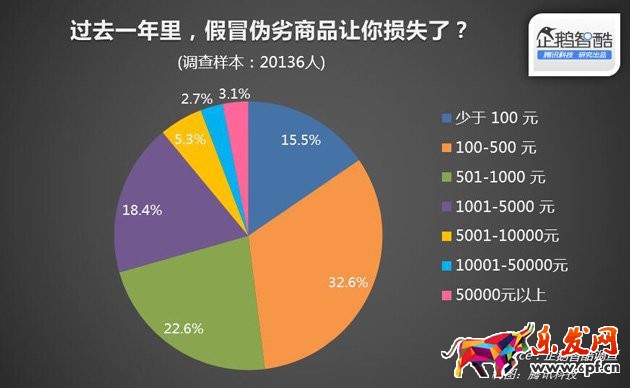 在過去一年里,有四成網民在假貨欺詐方面,損失了500-5000元人民幣。低于五百元的網民占比近半數。約3%網民損失金額超過五萬元。