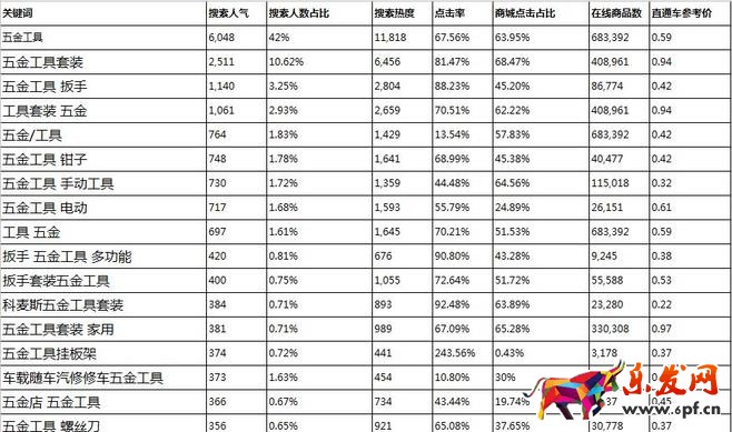 通過上圖,我們將我們所有整理的關鍵詞做成EXCEL表格出來,這里要說的一個點,我們在使用這些關鍵詞要看下他的搜索人氣,比如車載隨車汽修修車五金工具這個詞的搜索人氣才374個,如果這種詞我們要是放在標題的話,可能根本沒有人來搜索點擊,所以表格里面關鍵詞也要適當選取,還有就是所謂的藍海和紅海,關于這個問題的,相信大部分都知道關鍵詞的藍海和紅海判斷標準,在這里我不詳細介紹了。那除了這些,這張表格的數據還能給我們帶來什么東西呢?