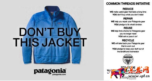 【案例】2011年11月,戶(hù)外服裝品牌Patagonia干了一件震驚整個(gè)服裝界的事。它在紐約時(shí)報(bào)上登了一大幅廣告,畫(huà)面是自家的戶(hù)外夾克R2,標(biāo)題卻是Dont’tBuyThisJacket(不要買(mǎi)這件夾克)。為什么?文字給出解釋?zhuān)篟2夾克是Patagonia的暢銷(xiāo)型號(hào),但這樣一件夾克在生產(chǎn)過(guò)程中需消耗135升水,足夠45個(gè)人每日飲用。于是文字呼吁:每件衣服的環(huán)境成本可能大于其售價(jià),所以如果舊衣服能翻新使用就要盡量這樣做,新衣物能不買(mǎi)就不買(mǎi)。