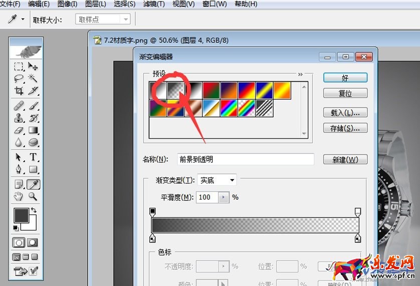 在點開的漸變面板中,我們要用第二個“前景到透明”的漸變。