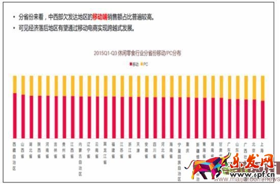CBNdata《報告》顯示,零食銷售排名前三的是:浙江省、江蘇省、廣東省,整個二線城市以接近50%的分布占據了休閑零食消費的主力軍。但是,同時,西藏、甘肅、青海等經濟欠發達的地區,增速非常快,市場潛力巨大。同時,還有一個更為重要的特點:中西部等經濟欠發達的地區,移動端消費的比重更高。
