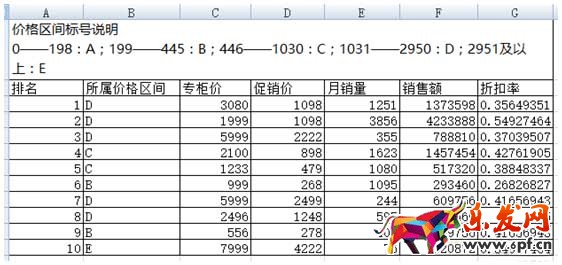 在這里我們為了省時間,所以僅僅提取了十個數據,實際操作的過程中,你至少要搞定第一頁(100個最好)的數據,實際上我們甚至建議搞定前兩頁的數據!為了方便統計,我們對價格區間(來自于淘寶搜索)進行了標號列示。然后銷售額的計算是銷量*促銷價,折扣率的計算是促銷價/專柜價