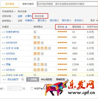 選擇“移動設備”,優先選擇有“手機標”及“熱”“潛”“錦”“擴”的詞,選擇相關性高、點擊率和點轉率較高的詞。