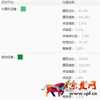 輸入關鍵詞,點擊“數據透視”,可看到相同關鍵詞再PC和無線行業平均效果數據,選擇在無線端點擊指數高、點擊率和點擊轉化率高的詞。