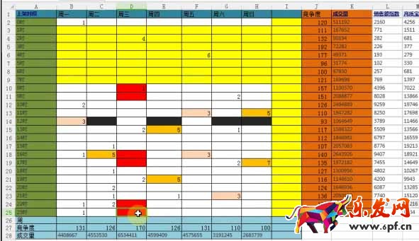 通過統計后,用不同的顏色來區分不同的出不同時間段是的競爭度。我們要避開競爭最大的,比如有五家的地方,我們不要和他們搶了。