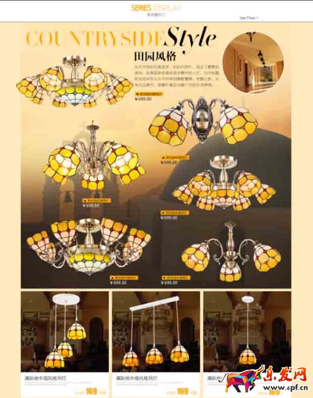 主推產品從顏色上與店招分級頁欄呼應,藍色的主推燈飾與浪漫的地中海結合,文案的描述使風格與燈飾自成一體,使消費者更容易記在腦里。【有心機的一個記憶法使用】