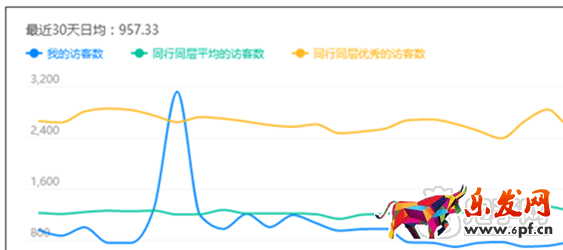 打開生意參謀的首頁,拉到第二屏的“核心指標”那里,第一個就是最近30天的日均訪客數,也就是流量,這里面一共是三條線,藍色的線是本店鋪的,綠色的線是同行同層均值,橙色的先是同行同層優秀的。