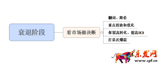 4、衰退階段:產品經歷很長一段時間的爆發期后就會面臨衰退期,尤其是季節性產品,此時要觀察該類目的市場銷售變化,決定是否提早撤資,減少直通車投入或轉移目標。這種情況下就要對直通車進行刪詞,刪除那些轉化低、ROI低的詞,或是對其進行降價,只保留那些產出比較高的詞,進行重點投放和優化,以少量高轉化的詞維持整個計劃的權重。該階段的重點就要改變,已不再是繼續打造爆款,而是要提高ROI。至于如何提高ROI?要么降價要么刪詞,保留那些ROI較高的詞。如果權重降低了,可以接著做次爆款,一方面對直通車來說不會使已經跑起來的車發生斷鏈,另一方面對店鋪來說東邊不亮西邊亮倒下一款再起一款。