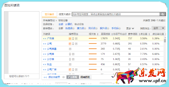 進入直通車,在左側菜單欄有個工具選項,下拉框里有“流量解析”,在這里輸入寶貝的主要關鍵詞,點擊查詢之后會有出現一些信息,包括“市場數據分析”“推廣詞表下載”“數據透視”“線上推廣排名”,添加關鍵詞時可以根據“推廣詞表下載”中“相關詞分析”和“相關類目下的熱門詞”提供的關鍵詞進行添加,選擇一些合適的進行測試。