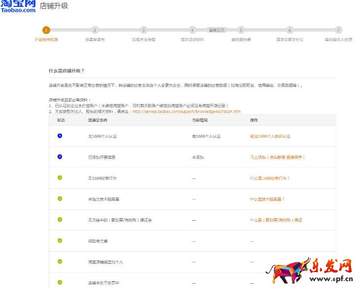 然后會對你的升級條件進行檢測,如果合格就可以繼續升級,反之就不行,店鋪的升級是在不影響正常經營的情況下,將店鋪的經營主體由個人變更為企業,同時保留店鋪的經營數據,像淘寶旺旺名、信用等級、交易數據、店鋪權重等等。既然要開企業店當然不可能說你要開就開啦,首先得是已認證的企業支付寶賬戶未綁定淘寶賬戶,同時其相關聯賬戶綁定的淘寶賬戶必須沒有淘寶開店記錄。然后關系類型為法人、股東的相關資料,當你打開店鋪升級的時候會有鏈接進去。